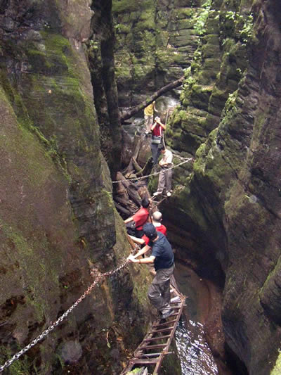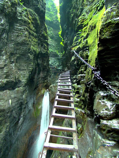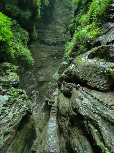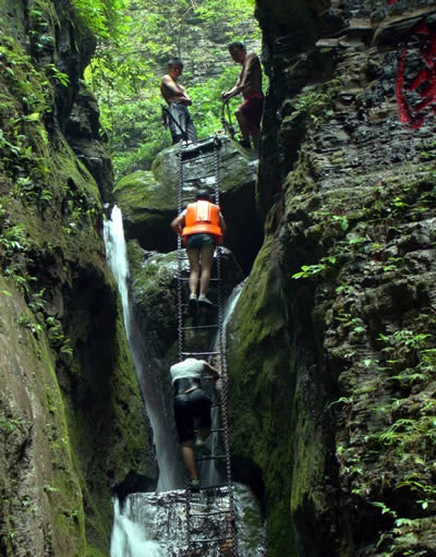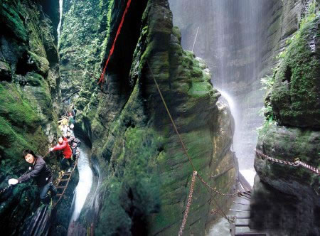 坐龍峽擁有中國第一條特種游道。所有游道均建于峽谷深處,依山取勢,既經(jīng)細(xì)心雕琢聽卻又渾然天成。粗樸的板栗木棧道,可以讓你零距離的親近那一潭碧幽、聽聞山泉叮咚;精巧的跳墩,可以讓你媳戲流泉、觸感溪瀑;原質(zhì)的石坎道,讓你不得不調(diào)動(dòng)全部的身心能量悉心攀援、感悟峽谷;有驚無險(xiǎn)的鐵梯,讓你伴著腳下轟鳴的溪水,在驚怵中體味一份快慰。出口處的土家山寨,保留了古樸獨(dú)特的生活習(xí)俗。一塊臘肉就一口醇香的“苞谷燒”會(huì)讓你洗去所有的疲憊,在輕松中憨厚的主人向你講述過去強(qiáng)人出沒的故事......