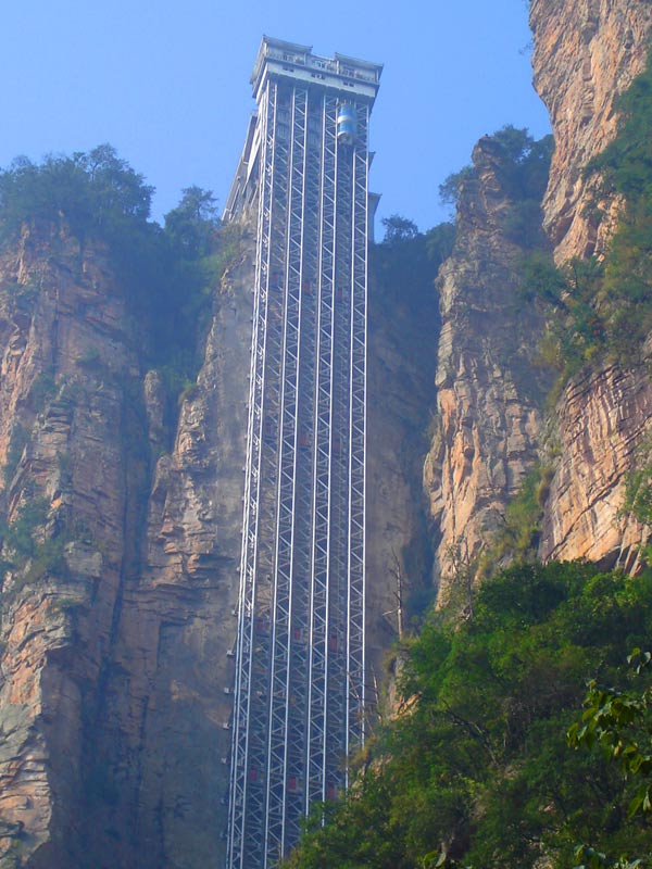 百龍?zhí)焯?BR>    百龍?zhí)焯,垂直高?35米,運(yùn)行高度326米,由154米山體內(nèi)堅(jiān)井和172米貼山鋼結(jié)構(gòu)井架等組成,采用三臺(tái)雙層全暴露觀光電梯并列分體運(yùn)行,每臺(tái)次載客50人次,運(yùn)行速度3米/秒,三臺(tái)同時(shí)運(yùn)行每小時(shí)往返量達(dá)4000人次。百龍?zhí)焯莸男藿▽?shí)現(xiàn)“山上游,山下住”的目標(biāo),提供了交通保障,將袁家界天下第一橋、迷魂臺(tái)、天懸白練以及烏龍寨、楊家界等絕世美景從幕后推向了前臺(tái),并將天子山、袁家界、金鞭溪等精品旅游線路連為一體,解決了多年困擾景區(qū)的交通瓶頸問(wèn)題。