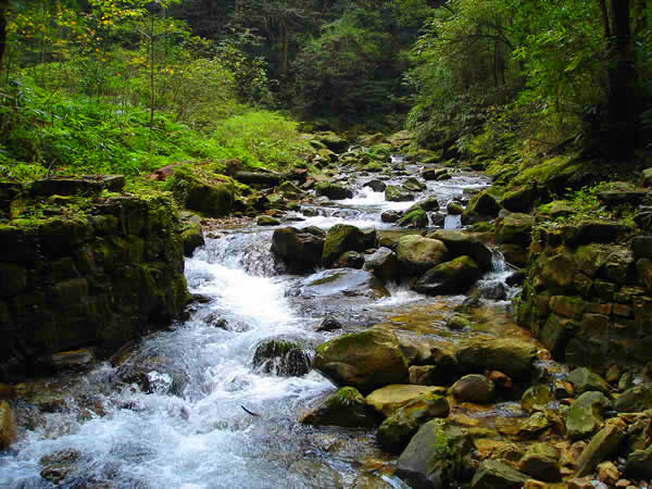 在黃石寨與袁家界之間有一道長(zhǎng)長(zhǎng)的峽谷將兩山隔開(kāi),峽谷中有一條小溪水,溪水從“天下第一橋”下面淙淙流過(guò),這便是有名的“沙刀溝”。