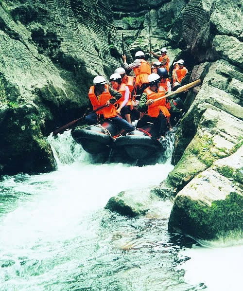 西門峽漂流全程6公里,屬萬溶江流域,它發(fā)源于兩頭羊自然保護(hù)區(qū)的群山之中;沿途危崖夾峙,樹木蔥榮,水質(zhì)清澈、急流、險(xiǎn)灘星落棋布。共有虎跳澗、白龍灘、臥龍灘、青龍峽、鬼見愁、龍王灘等急流險(xiǎn)灘30余個(gè)。其中以青龍灘最為著名,它全長400米,落差20余米。它和龍王灘一道堪稱國內(nèi)漂流之經(jīng)典。