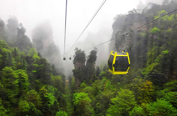 楊家界風(fēng)光 楊家界索道是世界自然遺產(chǎn)武陵源風(fēng)景名勝區(qū)繼天子山索道、黃石寨索道后的第三條客運索道,上站位于八里坡游覽線劉家檐,下站位于中湖鄉(xiāng)野溪鋪村。該索道采用法國,斔鞯涝O(shè)備,是世界頂級雙回路循環(huán)式配置八人車廂式索道,全長1876米,上下站垂直高差517米,線路支架14個,最高運行速度6m/s,最大運力為2300人/小時,單程運行時間5.2分鐘,是目前國際最先進的客運索道。