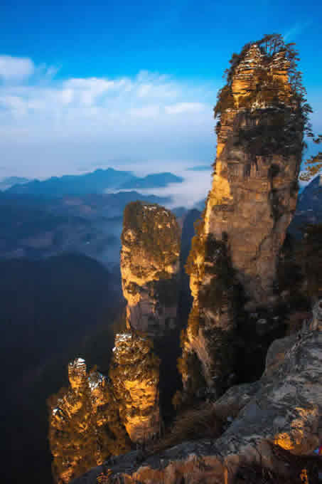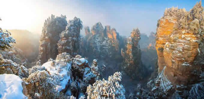楊家界雪景 作為世界自然遺產(chǎn)武陵源四大核心景區(qū)之一的楊家界景區(qū),地勢險要,風(fēng)景絕美,跟張家界、天子山、索溪峪比較,其中的地質(zhì)地貌一部分相同外,又有其獨特的資源優(yōu)勢,擁有全球罕見的峰墻群奇光。乘坐在舒適的楊家界索道里,可以盡情體驗“會當凌絕頂,一覽眾山小”的居高臨下與動感,360度暢游夢想般的楊家界仙界,俯瞰“近在咫尺”的千山萬壑,山舞銀蛇,千嬌百媚的絕美“峰墻”盡收眼底,無限風(fēng)光在險峰,數(shù)十道氣勢如虹的石墻,一排排層巒疊嶂,相對平行而立,高矮參差不齊,宛如“天然長城”,真是美輪美奐,絕景天賜,不得不讓人驚嘆大自然的璧山開地之功。