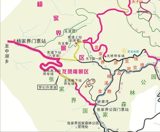 龍泉瀑布-楊家界風(fēng)光 3、中湖門票站進 中湖門票站——索道下站八里坡停車場:(乘車)15分鐘 楊家界索道運行時間5分鐘 索道上站——劉家檐停車場:(步行)5分鐘 劉家檐停車場——袁家界天橋停車場(乘車)10分鐘 劉家檐停車場——天子山停車場(乘車)25分鐘