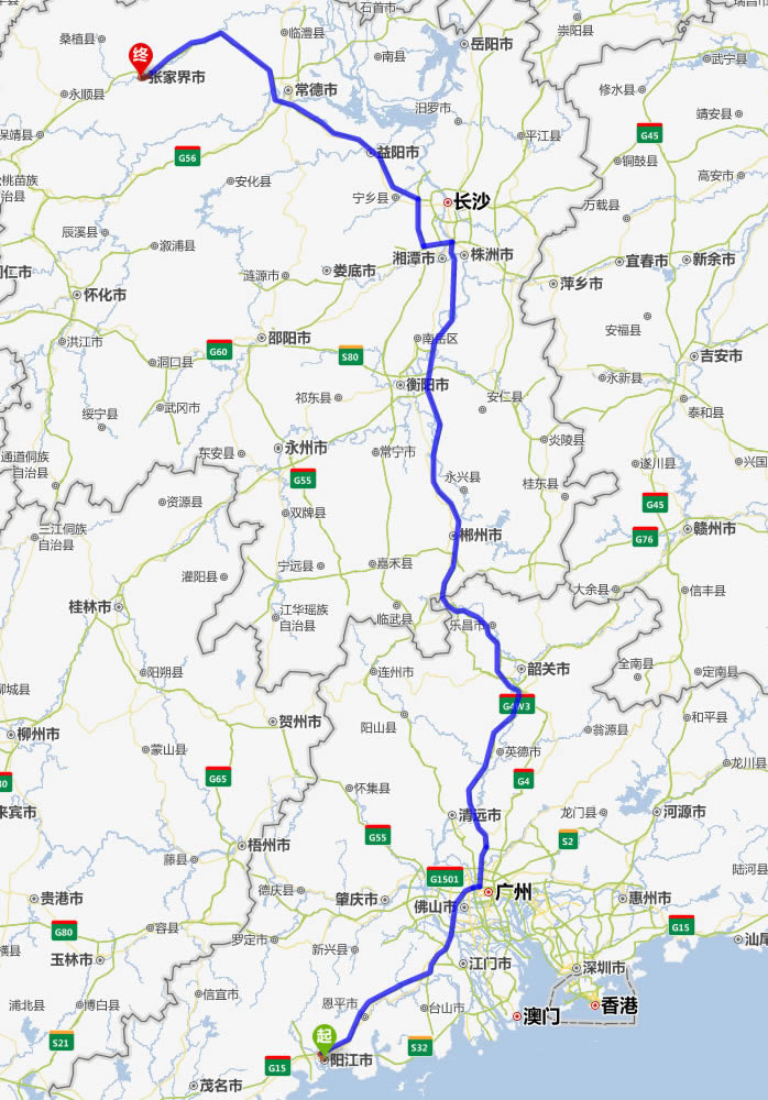 現(xiàn)在位置:張家界旅行社->交通指南->自駕車路線 -> 陽(yáng)江到張家界旅游自駕車線路,陽(yáng)江去張家界自己開(kāi)車要多長(zhǎng)時(shí)間,有多少公里
