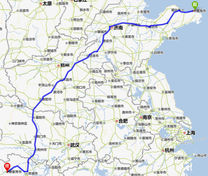 威海去張家界自駕車自助游線路圖全程高速):