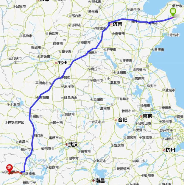 左右,沿途經過萊陽——維坊市——淄博——濟南——平陰縣——菏澤市——蘭考縣——許昌市——平頂山——南陽——襄陽——荊門——荊州——常德(也可以走國道經澧縣、石門縣)——慈利——張家界。