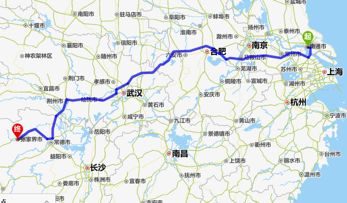 左右,沿途經過南通市——常州市——馬鞍山市——合肥——六安市——麻城市——仙桃市——潛江市——荊州市——常德市(這里可以不走常德,直接從荊州經澧縣、石門縣到慈利縣)——慈利縣——張家界。