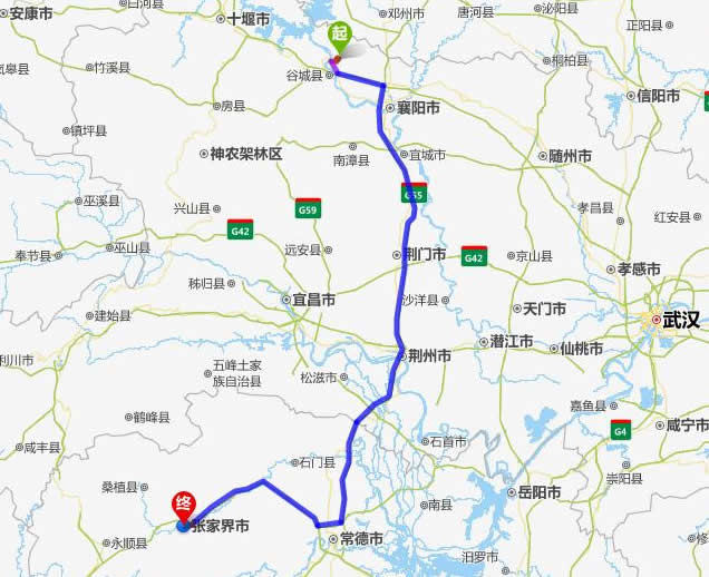 左右,沿途經過老河口——襄陽——荊門——荊州——公安縣——澧縣——常德(也可以走國道經澧縣、石門縣)——慈利——張家界。