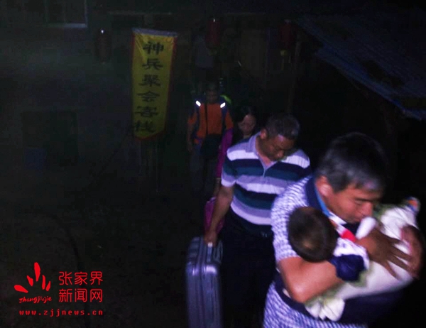 晚上9時許,由天子山景區(qū)管委會干部職工、居委會居民組成的應急隊伍冒雨趕到老屋場,對入住游客和當?shù)鼐用褚灰贿M行耐心解釋,勸導他們連夜轉(zhuǎn)移到安全地帶。