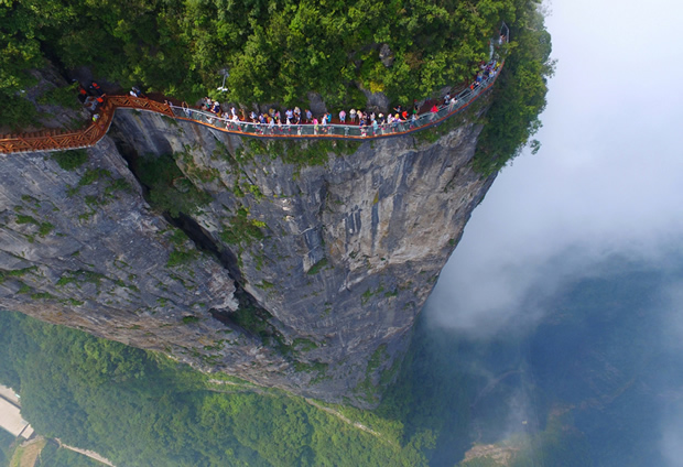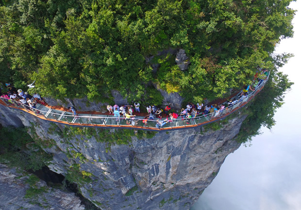 因站在玻璃棧道上能俯瞰天門山99道彎盤山公路而得名“盤龍崖玻璃棧道”