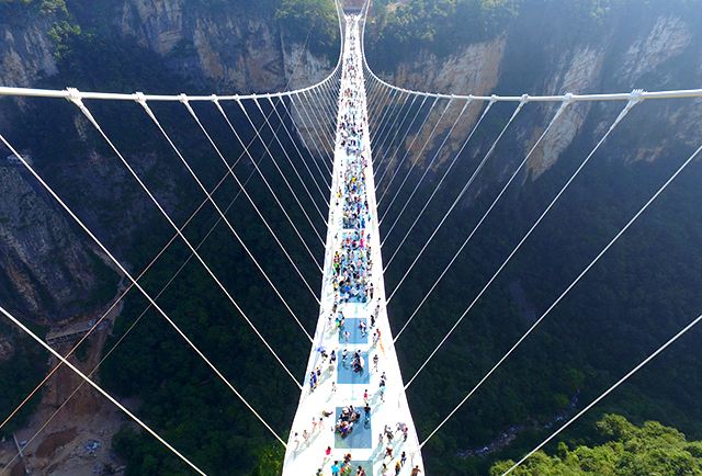 張家界大峽谷玻璃橋橋面由99塊全透明玻璃鋪設(shè),橋面總長430米、寬6米,距谷底相對(duì)高度約300米,游客走在橋上就可以清楚地看到腳下的懸崖峭壁,好似行在空中,非常刺激,被美國有線電視新聞網(wǎng)列入世界上11座最壯觀的橋之一。目前,張家界大峽谷玻璃橋已經(jīng)成為世界旅游的一張響亮名片。